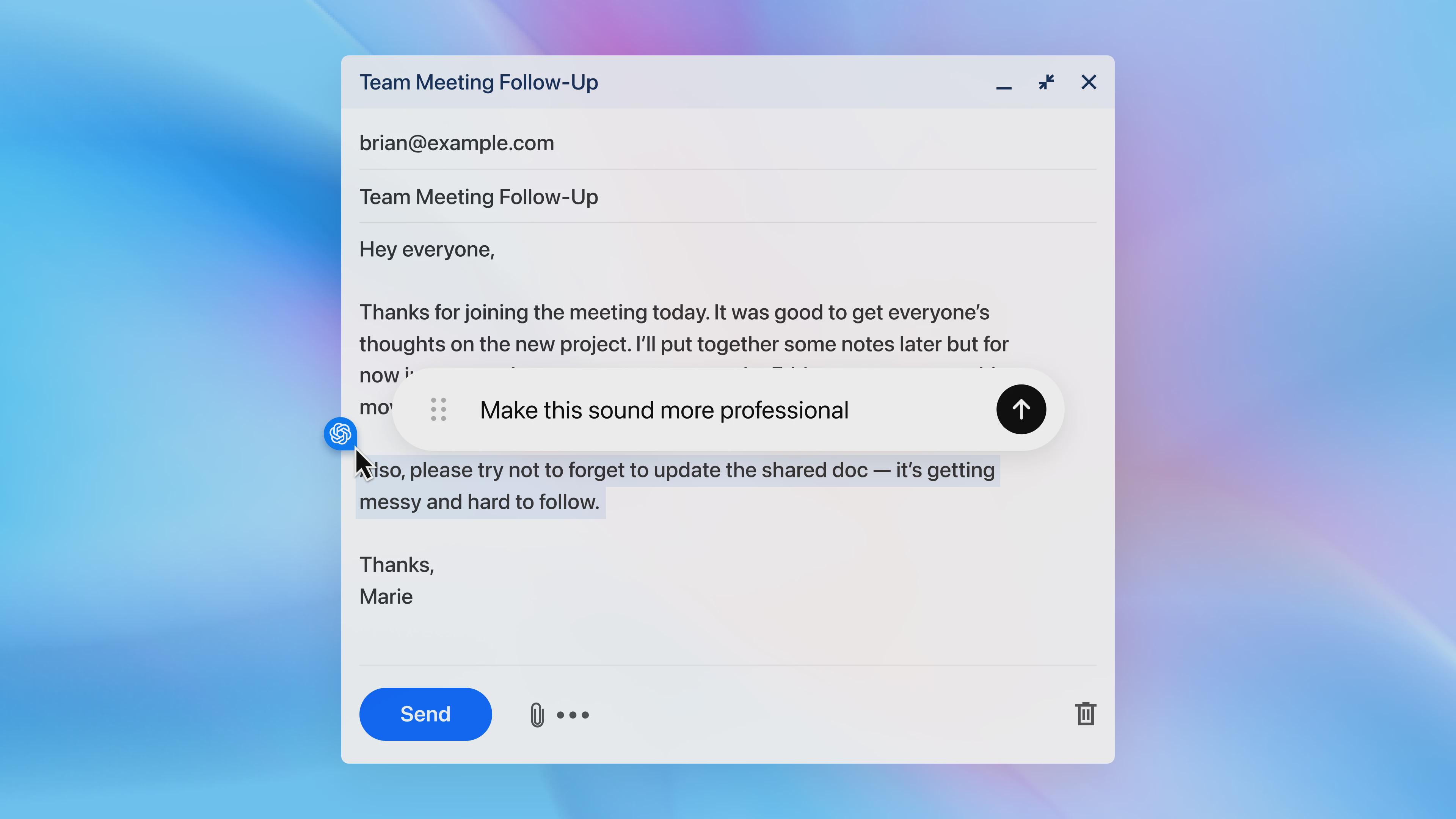 值得一提的是“光标聊天”(cursor chat)新功能。用户只需选中任意句子,即可让ChatGPT即时进行润色或编辑。比如,在Gmail或其他Google Workspace应用中,用户可直接要求浏览器内的ChatGPT协助撰写邮件。
