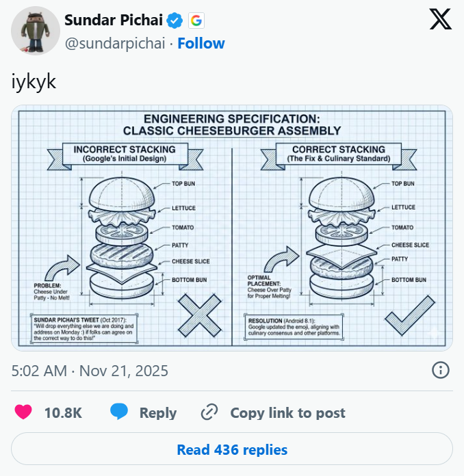 本周,谷歌CEO桑德尔·皮查伊(Sundar Pichai)发了一条只有五个字母的推文:“iykyk”(懂得都懂)。配图是一张由AI生成的、鲜美多汁的芝士汉堡。
