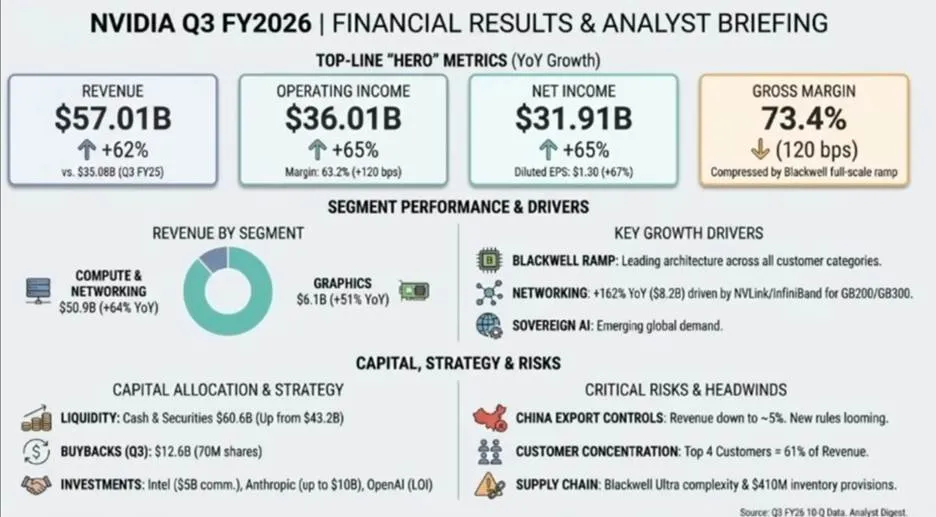 英伟达势不可挡: 英伟达最新季度财报营收达570亿美元,超华尔街预期。CEO黄仁勋坦言:“Blackwell芯片供不应求,AI正无处不在。”