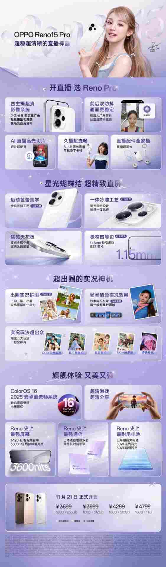 OPPO Reno15 Pro 提供星光蝴蝶结、极光蓝、可露丽棕、蜜糖金等配色,采用 6.78 英寸直屏,同样搭载联发科天玑 8450 芯片,内置 6500mAh,支持 80W 有线快充、50W 无线快充、旁路供电,后置 5000 万像素超广角、2 亿像素主摄、5000 万像素 3.5X 潜望长焦,前置 5000 万像素超广角摄像头。