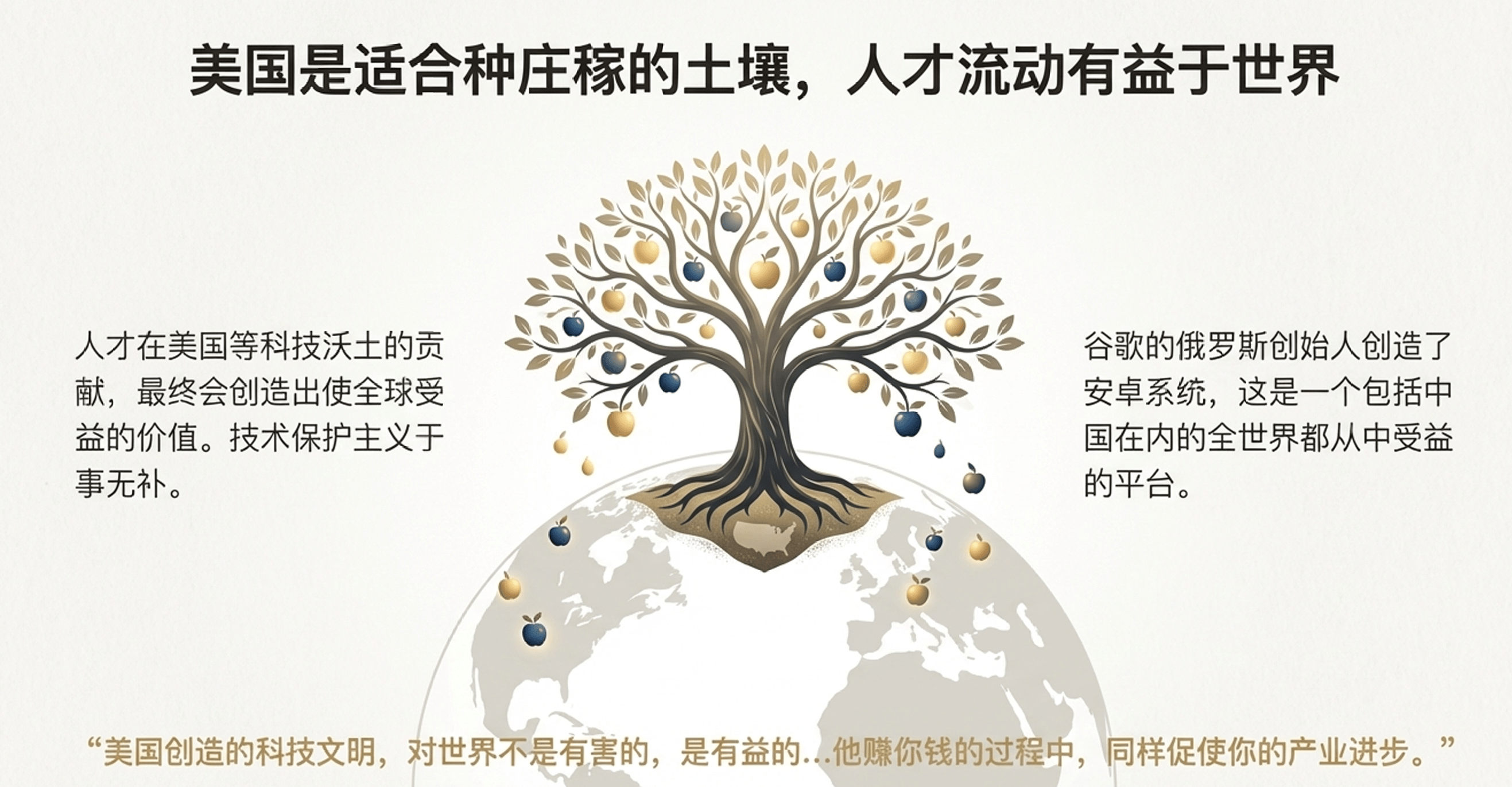 任总:美国的土壤是适合种庄稼的,大量人才到美国成长这是好事情,并不是坏事情,包括中国的很多青年到美国去,在美国生根发芽,参与创造一些新的科技文明。谷歌创始人就是俄罗斯人,他们创造的安卓,全世界不是都在享用嘛!对中国也是受益的。没有说苹果、微软、英伟达、英特尔……,不给我国创造价值,也在创造价值。美国只是不准华为使用含美国元素的东西,并不等于不准中国用,也没有不准世界用,所以全世界人才到美国创造一种技术文明是有益于世界进步的。至于他个人的才能在美国发挥了价值,享受了美国的生活,这也是可以理解的。